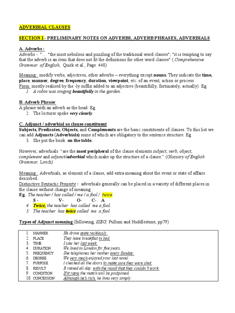 Adverb clauses (adverbial clauses) are groups of words with a subject and a verb that function as adverbs adverb of time and place. Most adverbs can be placed in different parts of a sentence without changing the meaning of the sentence.